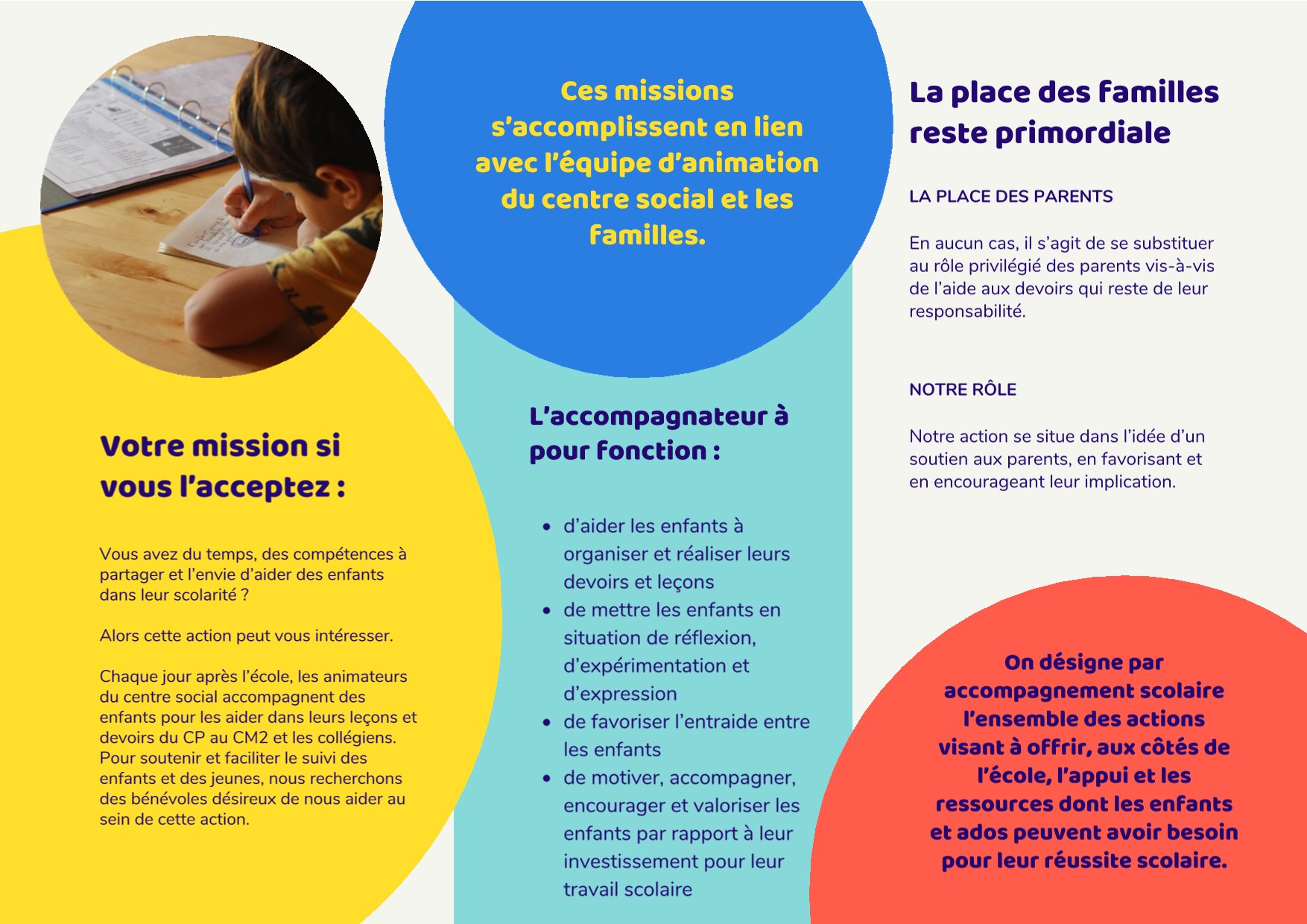- Un temps consacré à l’aide aux leçons, sauf les veilles de samedis libérés. Ce temps n’a pas pour objet de refaire les leçons vues en classe, ni de faire des exercices complémentaires mais il permet aux enfants volontaires d’effectuer des recherches demandées par les professeurs des écoles, et de réciter les leçons, tables ou poèmes à apprendre. Le rôle des animateurs, se limite à un accompagnement des enfants. Nous souhaitons que ce travail s’effectue en relation avec les parents qui restent responsables du suivi scolaire de leur(s) enfant(s).